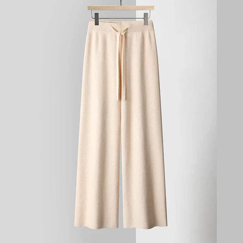 Transform your loungewear into luxury with these cloud-soft wide-leg trousers. Crafted from premium cashmere-blend knit, they feature a flowing silhouette that moves gracefully with each step. The self-tie waist adds a refined touch while ensuring the perfect fit.